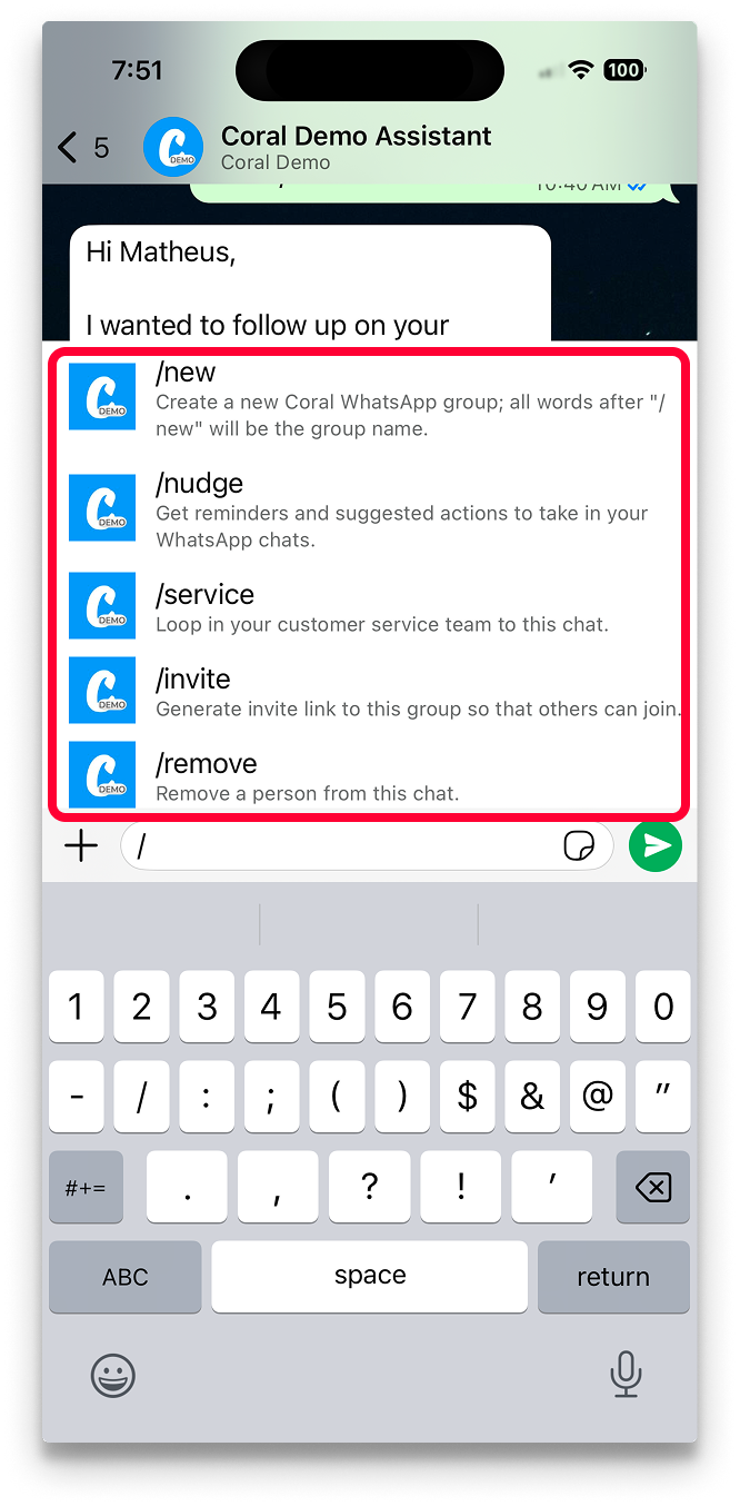 A Coral equipa os funcionários com menus de comando incorporados diretamente no aplicativo WhatsApp. Isso facilita o acionamento de ações estruturadas em tempo real sem sair da conversa. Esses comandos devem estar disponíveis apenas para o funcionário e não para outros participantes, outra camada lógica que a Coral criou e que não está disponível na API bruta de grupos do WhatsApp.