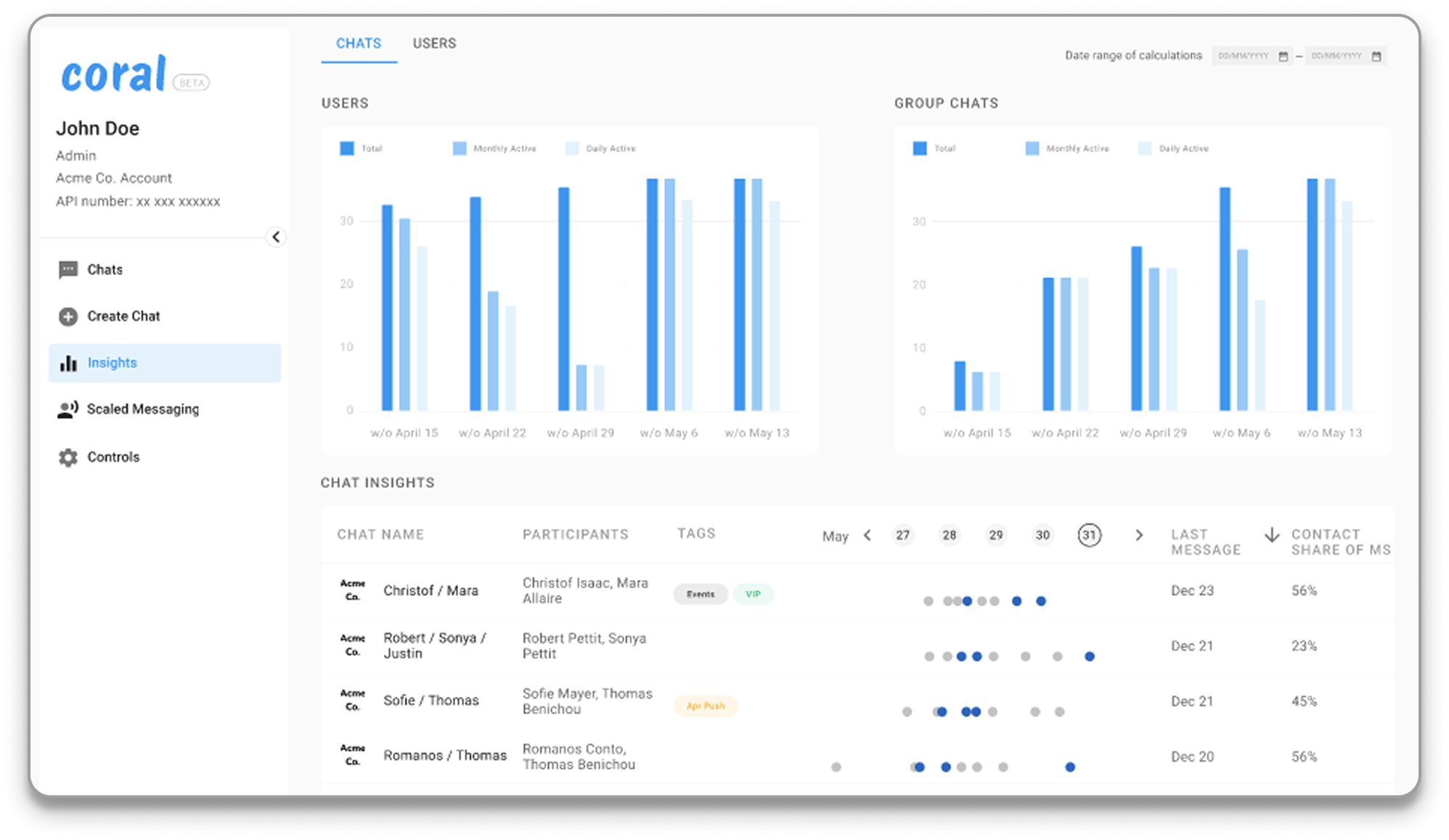 Nos complace anunciar el lanzamiento de nuestro nuevo Panel de control de Insights, ahora disponible como pestaña en la aplicación web Coral, para gerentes ocupados que no tienen tiempo para monitorear y entrenar a su equipo sobre las interacciones con los clientes a través del canal de WhatsApp. El panel de Insights brinda a los gerentes una visión completa de la actividad de WhatsApp en sus equipos de vendedores, para que puedan saber cuándo y dónde tomar medidas. Está diseñado para responder preguntas críticas como:
