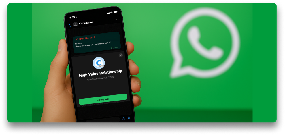 Nos complace anunciar que se ha lanzado la API Mínimo Viable Product (MVP) de Coral Messaging para grupos de WhatsApp. Por primera vez en la historia, las empresas pueden obtener visibilidad completa del chat de WhatsApp con información, y los empleados pueden aumentar la productividad y las ventas. Esto es especialmente valioso para los equipos que tienen contacto con clientes: piense en banqueros, servicios y productos de lujo, vendedores de empresas, corredores de bienes raíces y más. Todo construido sobre la API de Grupos de WhatsApp, en colaboración con WhatsApp/Meta.
